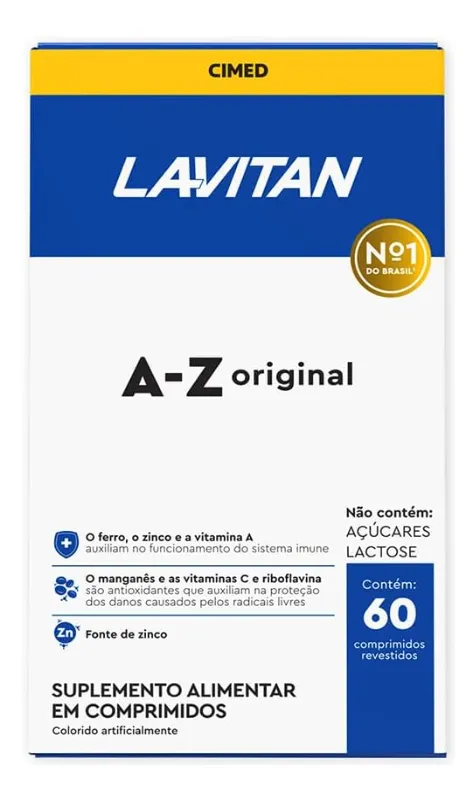 Lavitan Multivitamínico A-Z Original é um suplemento alimentar desenvolvido para complementar a ingestão diária de vitaminas e minerais essenciais. Produzido pela Cimed, é apresentado em embalagem com 60 comprimidos e indicado para adultos que buscam suporte nutricional no dia a dia, conforme orientação de profissional de saúde.